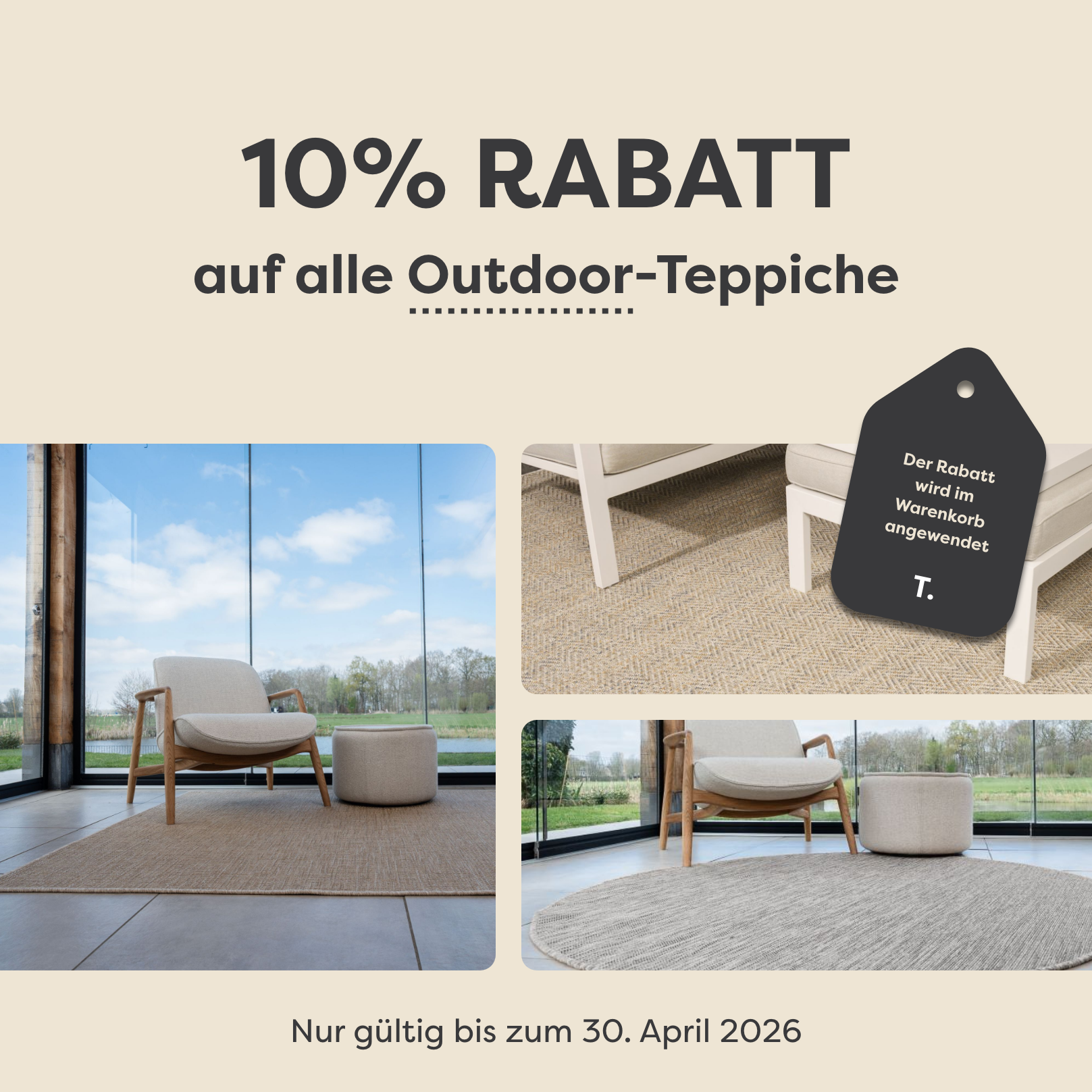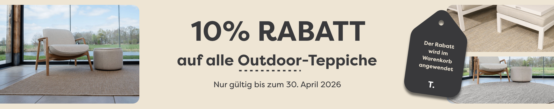 Outdoor-Aktion: Profitieren Sie bis einschließlich 30. April von 10 % Rabatt auf alle Outdoor-Teppiche. Der Rabatt wird automatisch im Warenkorb abgezogen.